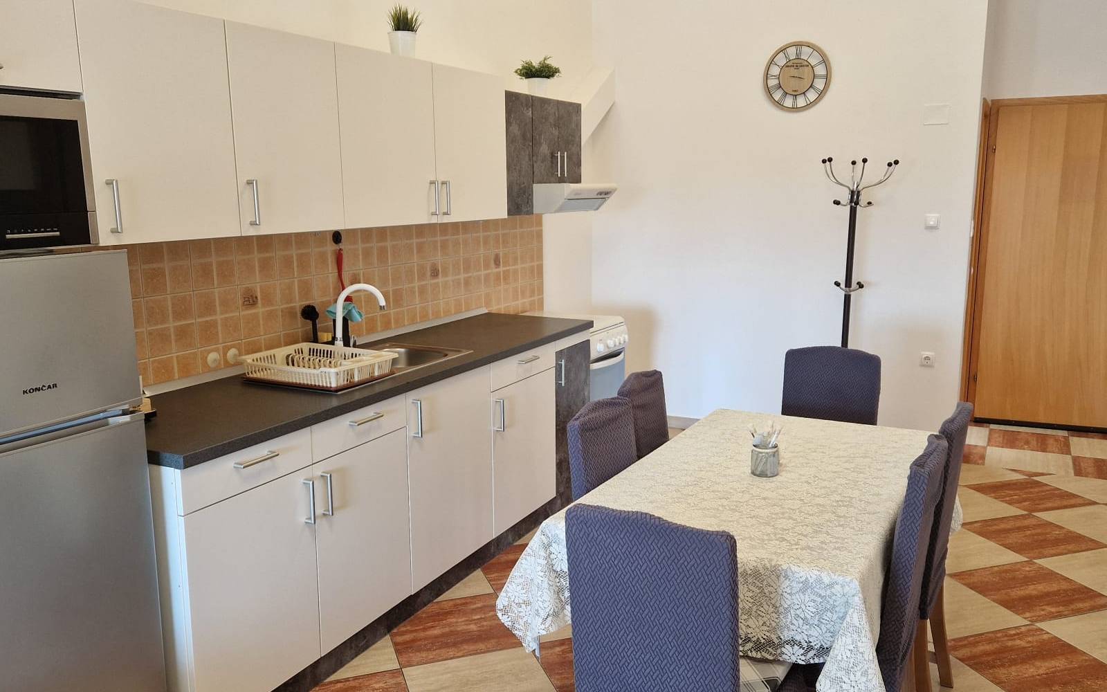 · Kuhinja: Potpuno opremljena kuhinja s modernim aparatima uključuje štednjak, pećnicu, hladnjak s zamrzivačem, aparat za kavu, mikrovalnu pećnicu i kuhalo za vodu, kao i sve potrebne kuhinjske potrepštine. Blagovaonski stol s odgovarajućim stolicama omogućava udoban prostor za objedovanje.