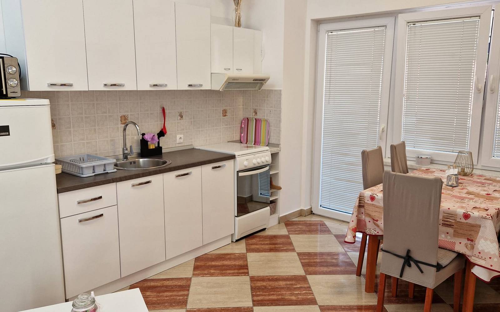 · Kuhinja: Potpuno opremljena kuhinja s osnovnim aparatima i kuhinjskim priborom (štednjak, zamrzivač, aparat za kavu, kuhalo za vodu), te blagovaonskim stolom i stolicama za sve goste.